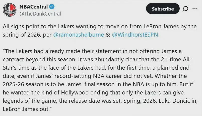 ESPN报道,湖人明确表示不会在2026年夏天,为詹姆斯提供一份续约合同,意味着宣告双方的合作进入了倒计时。